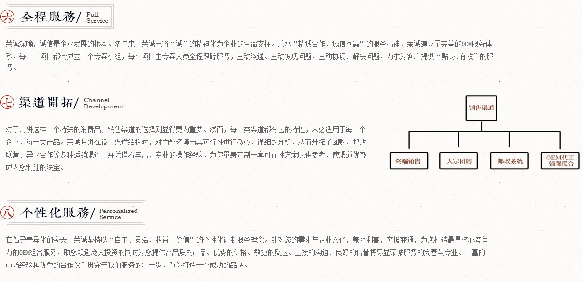 榮誠(chéng)作為一家高標(biāo)準(zhǔn)、規(guī)范化、規(guī)模化的專業(yè)烘焙生產(chǎn)企業(yè),依靠強(qiáng)大的專業(yè)能力,每年可為上千家企業(yè)提供形式靈活、創(chuàng)意時(shí)尚的個(gè)性化定制服務(wù),業(yè)務(wù)類型覆蓋:合作授權(quán)定制、酒店禮食定制、渠道創(chuàng)意定制、集團(tuán)福利個(gè)性化定制、跨界聯(lián)名定制等各式各樣的定制需求。榮誠(chéng)與多個(gè)省市的中國(guó)郵政、中國(guó)聯(lián)通等大型企業(yè)單位建立長(zhǎng)期合作,提供專屬定制禮食產(chǎn)品,接受客戶及第三方檢測(cè)機(jī)構(gòu)的專業(yè)嚴(yán)格驗(yàn)廠。在渠道端二十多年的市場(chǎng)耕耘,榮誠(chéng)與沃爾瑪、大潤(rùn)發(fā)、世紀(jì)聯(lián)華等各大連鎖KA賣場(chǎng)建立穩(wěn)定的合作,產(chǎn)品與服務(wù)獲得消費(fèi)者的廣泛認(rèn)可。