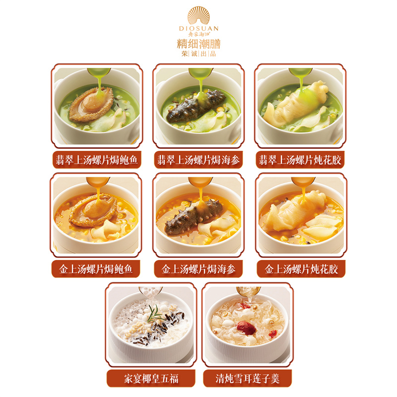 225g翡翠上湯螺片焗鮑魚x1,225g翡翠上湯螺片焗海參x1,225g翡翠上湯螺片燉花膠x1,225g金上湯螺片焗鮑魚x1,225g金上湯螺片焗海參x1,225g金上湯螺片燉花膠x1,225g家宴椰皇五福x1,225g清燉雪耳蓮子羹x1